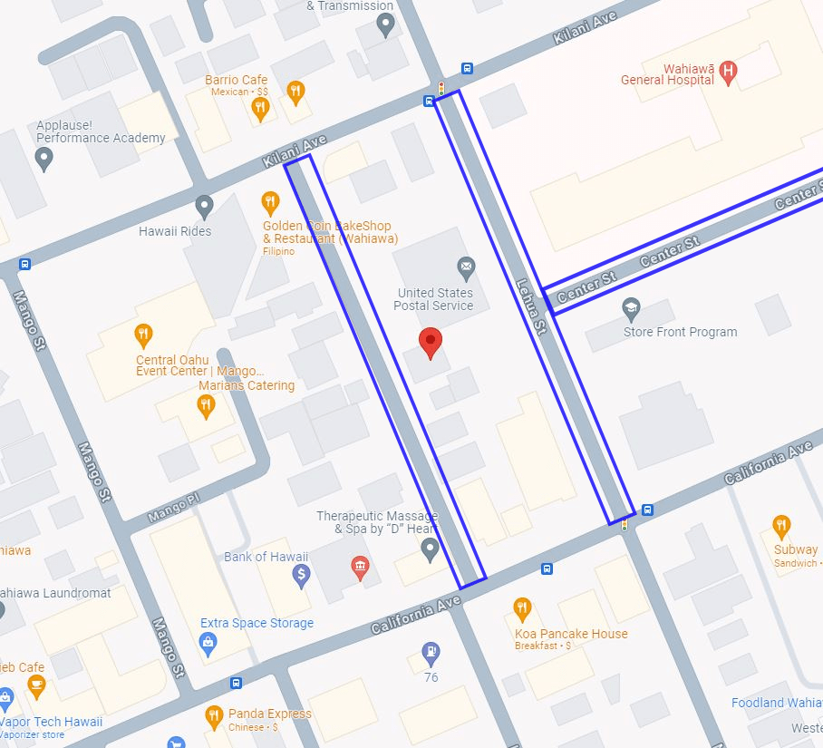 We are located at 54 Westervelt Street, behind the Post Office and Bank of Hawaii. There are a few public parking slots on Westervelt and Lehua Street, as well as on Center Street a bit further out.
